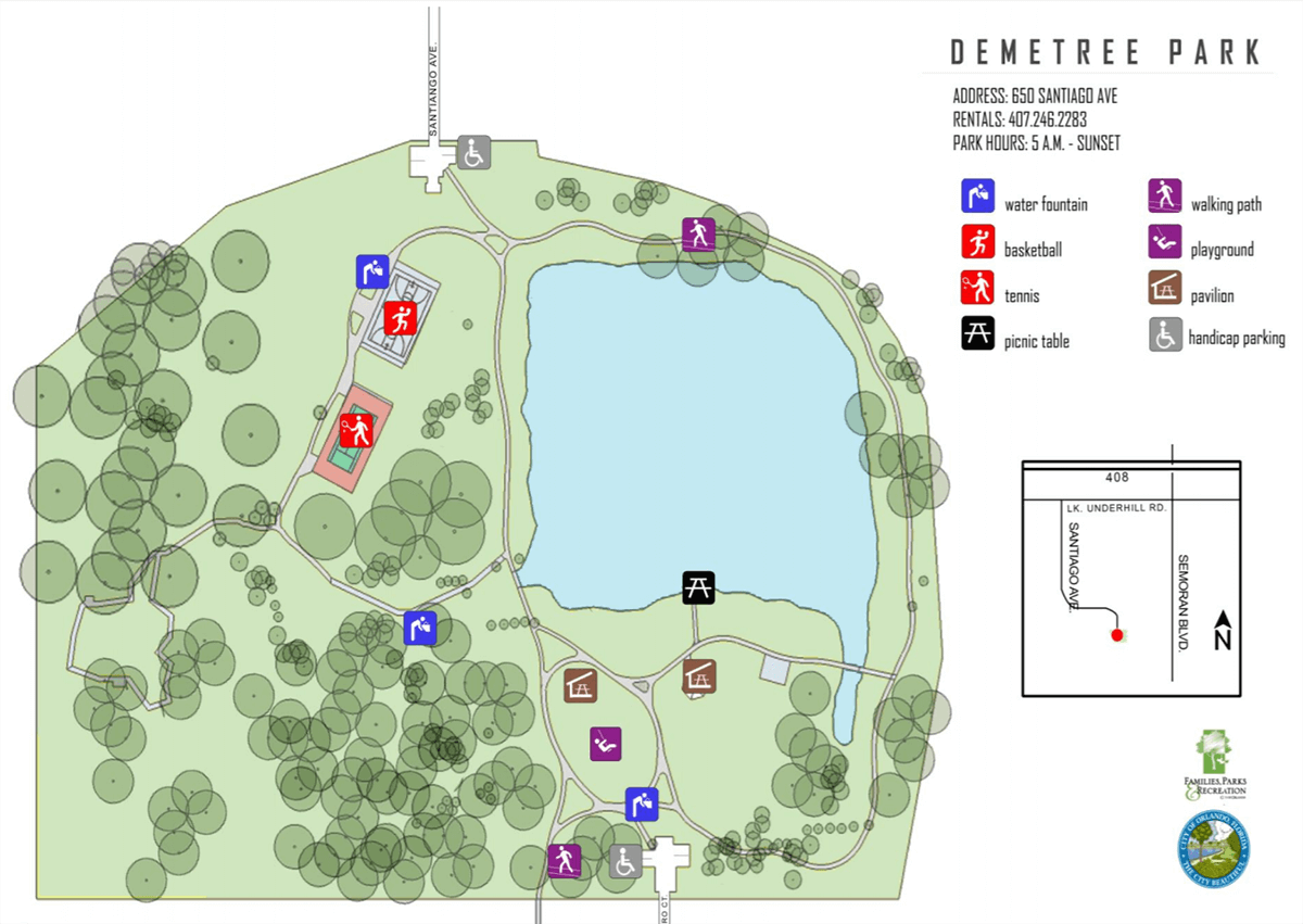 Demetree Park se desarrolló en 1988 como un parque para la comunidad que ofreciera una variedad de actividades. El parque de 24.6 acres bordea tres lagos por un sistema de caminos y pasarelas. La pasarela recorre un área boscosa ofreciendo un ambiente natural para caminar, observar las aves y descansar. Las áreas más desarrolladas del parque incluyen un muelle para pescar, un área infantil de recreo, áreas para picnic, una cancha de tenis y una cancha de baloncesto. El estacionamiento es limitado.